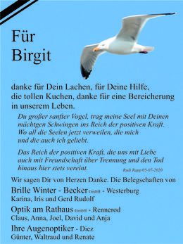 Wir wünschen allen die um Birgit trauern, viel Kraft und unsere aufrichtige Anteilnahme.
