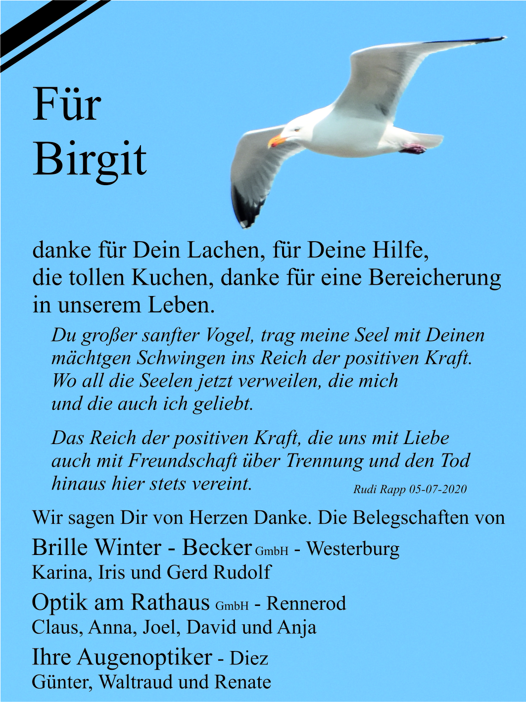 Wir wünschen allen die um Birgit trauern, viel Kraft und unsere aufrichtige Anteilnahme.